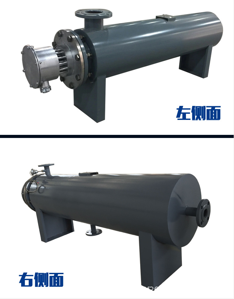 管道加热器分为两种模式:一种是采用管道加热器内部的法兰式管状电热元件倒插在管道加热器中的反应釜夹套中加热导热油,将管道加热器中的热能传输给管道加热器内部反应釜中的化工原料。还有一种方式是直接在管道加热器中的反应釜中插入管道加热器中的管状电热元件或在管道加热器的壁四周均匀分布电热管。这种模式称为管道加热器的内热式。管道加热器的内热式升温快、效率高。